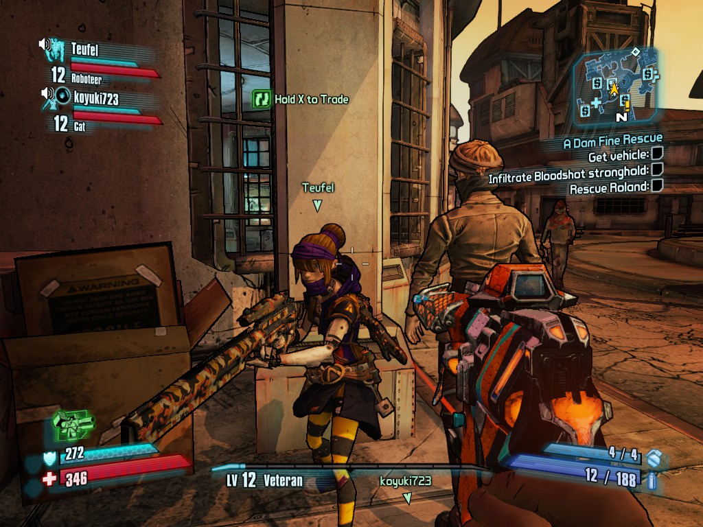 Surprisingly, she didn’t suck at this part. Daughter and I have co-oped before. We play Halo: Reach on the Xbox. She is the sort of player who runs into the midst of everything and lets off a grenade. If she lives, it’s a success. If she dies, it’s my job to revive her. She employed much the same method of play in Borderlands, much to the dismay of Husband. At least there is no friendly fire in Borderlands…unless someone blows up a nearby gas tank, which a certain someone did just after reviving me. (We look for opportunities to do this now. I think the score is even at the moment.)