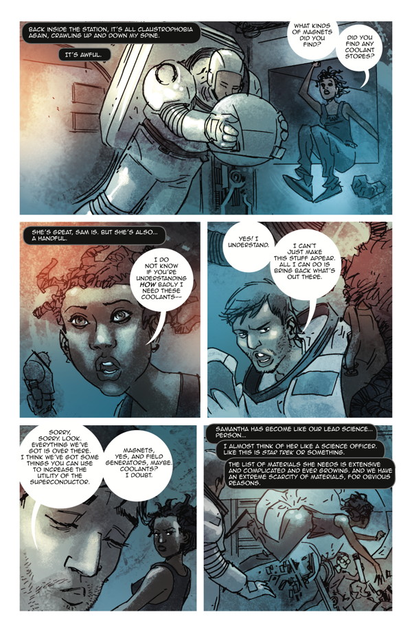 Samantha has become the lead ‘science person’ or as Brandon prefers, their science officer. I love this observation. It feels very human and age appropriate, though I’d likely make the same comment and I’m a lot older than the Vitros. Also, he has a crush on her, which is adorable. His girlfriend, Lila, probably wouldn’t agree. His observations regarding Lila are bittersweet. She’s obsessed with returning to Earth and has been spending a lot of time with Hyde. The pair are, quote: Thick as thieves.