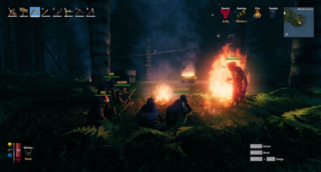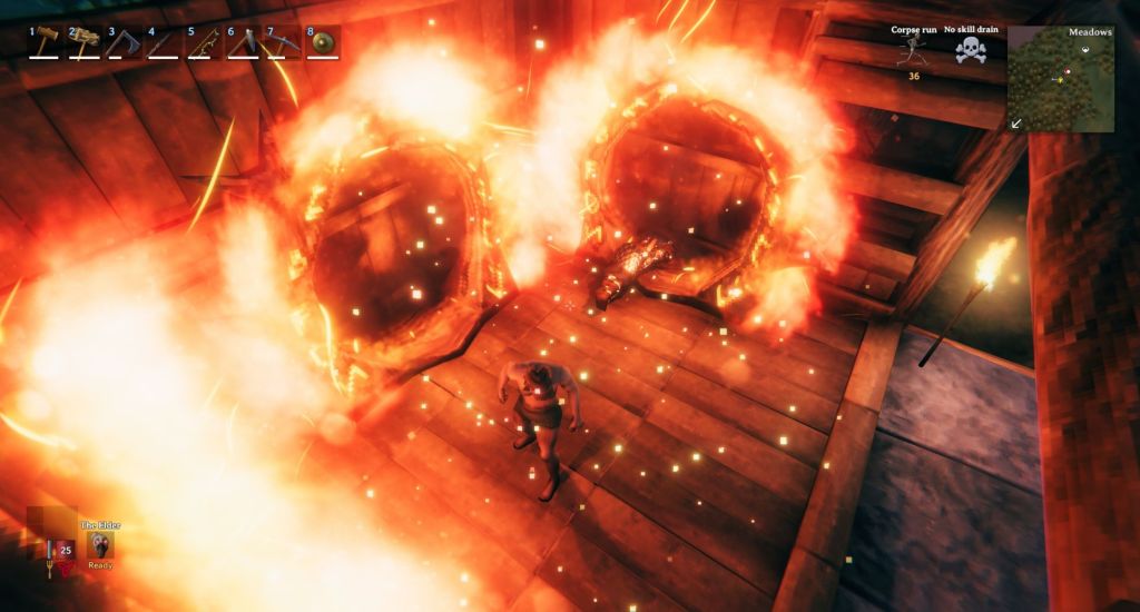 Our second boss fight did not go as well. First, we left someone ashore and had to steer the karve (bigger than a raft, but not by much) back to get them. Then several of us died trying to hike over a mountain, succumbing to the freezing temperatures or the wolves. Thankfully, we had portal technology by then. We’d plopped one down on the opposite shore, meaning that after revival, it was a simple matter of running nearly naked through the village to the longhouse and hopping through a ring of fire. That done, we’d then have to drive our characters back up the mountain and try to get our stuff before we froze again. Or got attacked again.