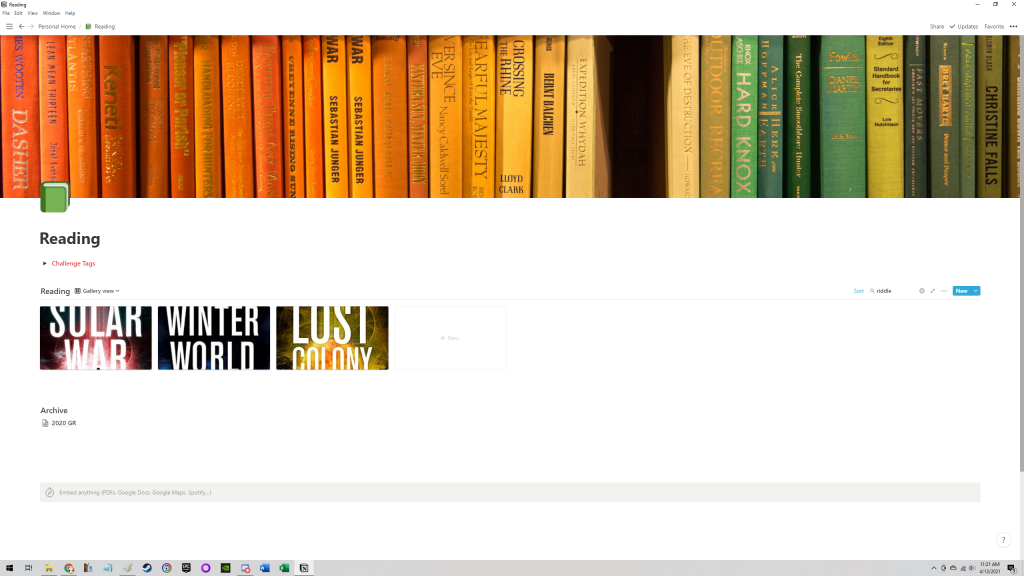 If I did want to see how many books I’ve read in 2021, however, or by a single author, or in a single series, I can learn all of that by using a sort, and I can create a sort in ANY view. So I can sort my lovely gallery by author and see that I’ve read three books by A.G. Riddle.