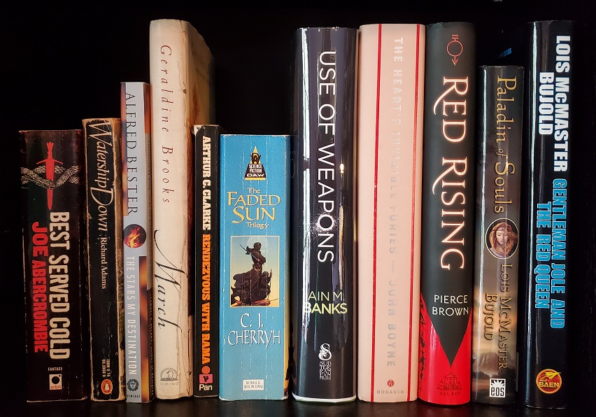 I hit on this particular theme while exploring ways to narrow the selection for this post. The next step was to step into my home library and peruse the shelves. I already knew some of the titles I’d be featuring, or some of the authors I’d like to include, but I have so many books (around 2000) that I wanted to bop along the shelves and see what was there. This is one of the reasons I keep a home library. I love visiting with my books. I’ll pause by a series or an author and reminisce for a while. Recall why this book or that series are favourites.