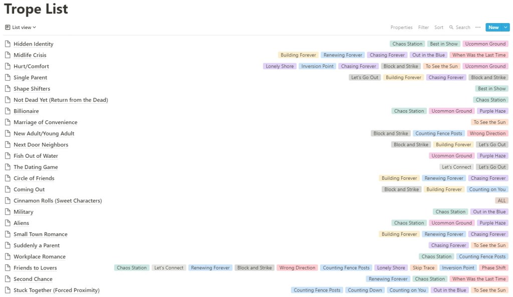 Because I like sorting things and charting things, I decided to break it down. Check out which tropes I like writing and how often. Because Notion is my new favourite thing, I started there, listing tropes I thought might fit at least one of my books.