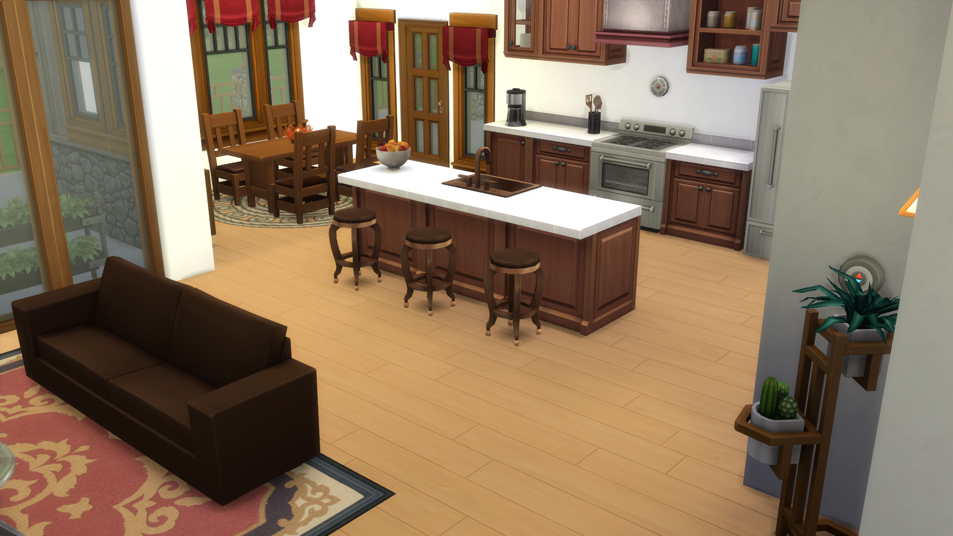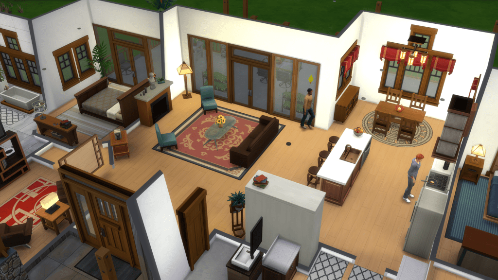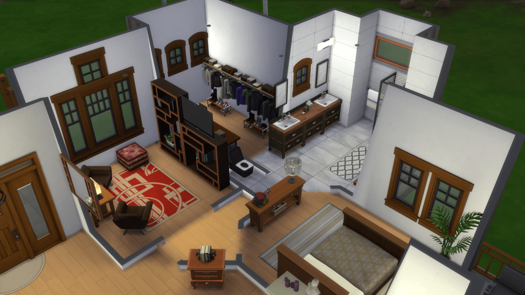 In The Sims, I used the move objects cheat to place windows and doors exactly where I wanted them, some furniture and decorative objects too. I also used the motherlode cheat with one of my Sims to fund his purchase of the house so I could get in there and take pictures with game camera. I also toured him around the place checking that everything worked and didn’t find any stupid bugs—except for the one door without an exterior staircase because diagonal staircases are not a thing.