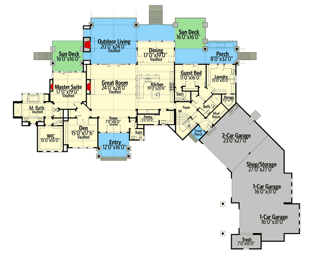 For my grand project, I scouted some of my favourite architectural plan sites for a floorplan that forced me to go big, knowing that the challenge would be customizing the plan to accommodate the building tools, the terrain, and the unique play style of each game. I wanted both builds to be fully functional.