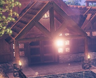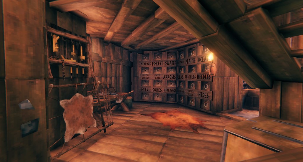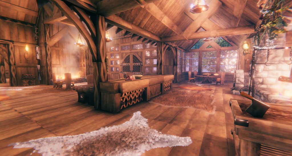 My second house grew through several iterations as the game developed and I discovered a need for extra rooms for new crafting stations and upgrades. The final result was a small, two-story manor in a style that seemed to fit the environment and the game. It wasn’t as sprawling, expansive, or ambitious as some of the projects my friends were undertaking, but I loved the cozy feel of it, especially when it rained. With all the fireplaces and lamps lit, the wooden interior glowed with warmth.