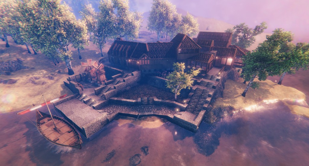 I landscaped the front of The Sims build, but didn’t do a lot with the front of the Valheim build, aside from pave and fence against local pests. I landscaped the back of the Valheim build extensively, though, to include a terraced farm, windmill station, and dock.