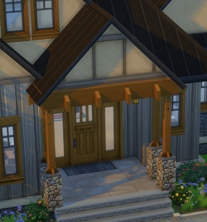 These two things were my biggest challenges with this build in The Sims. I put a square staircase in a diagonal area and it doesn’t look terrible. But it means the tower is larger in the Sims build, which doesn’t look terrible either. There are no steps to the side door because there just aren’t and I gave up trying to make that door face the right way and still work with an attached-looking garage about fifteen hours into the build.